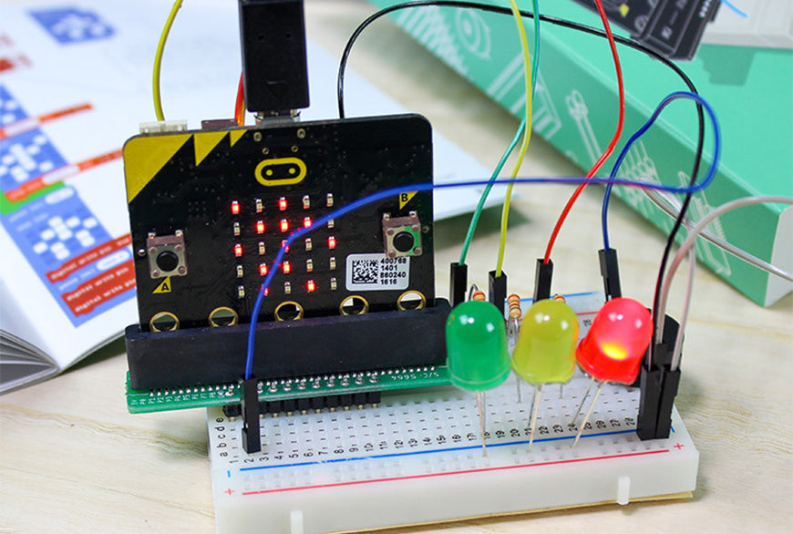 The tutorial book included inside the Discovery Kit contains a lot of detailed information, including everything from what a prototyping board is to how to use Microsoft MakeCode editor. All parts, excluding the micro:bit, are included in the kit so you can build your first circuit in minutes!
