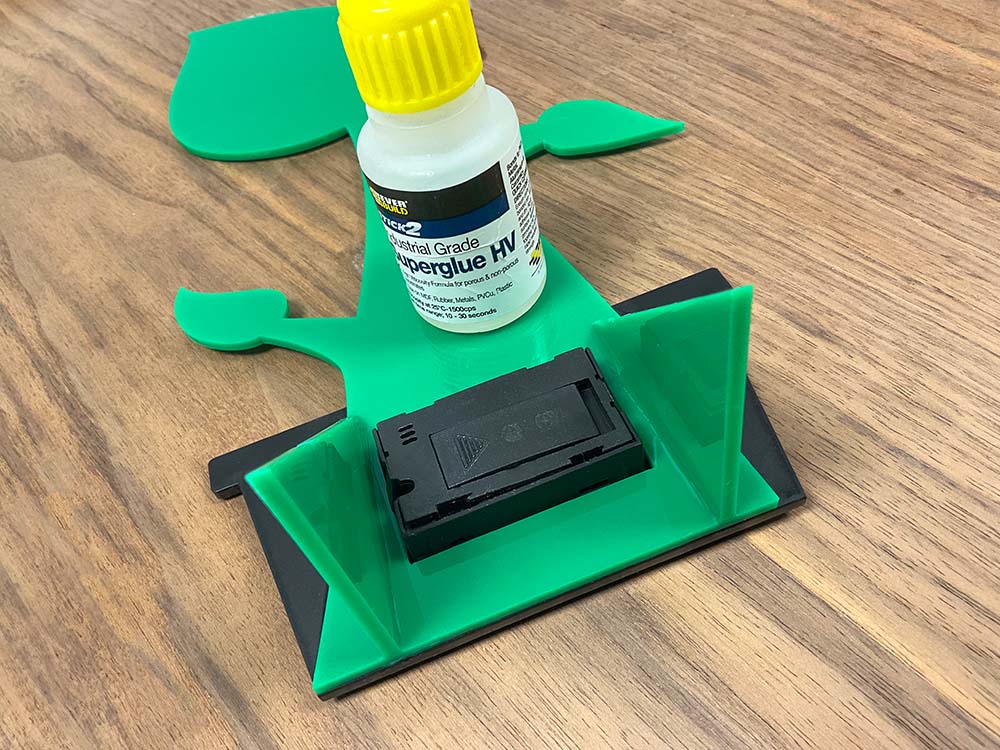 Clean off any particles made by the engraving and glue the pot to the plant, aligning the hole for your temperature module. Once set, glue the stand legs to the back of the plant.