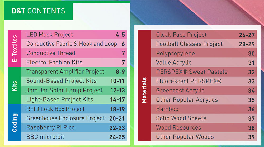 It’s been a big six months for new products and new resources and this flyer showcases them all. The flyer is split into five sections; E-Textiles, Kits, Coding, and Materials. We’ve put work into each of them to ensure that this flyer delivers big, you’ll see straight away that we’ve ensured that we have exciting new products and resources all the way through. We’ve also produced information based resources for various materials product groups, which are all highlighted in the flyer.