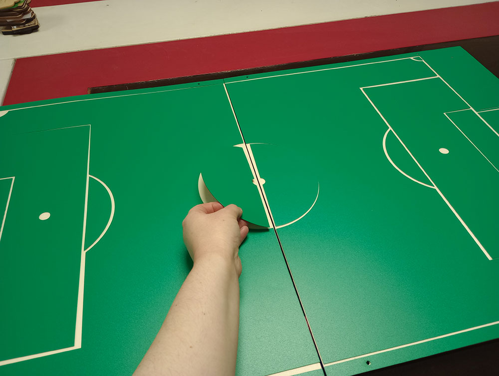 Using double-sided tape, attach the polypropylene pieces to the wooden base. Make sure the screw holes and the goal post slots are lined up.