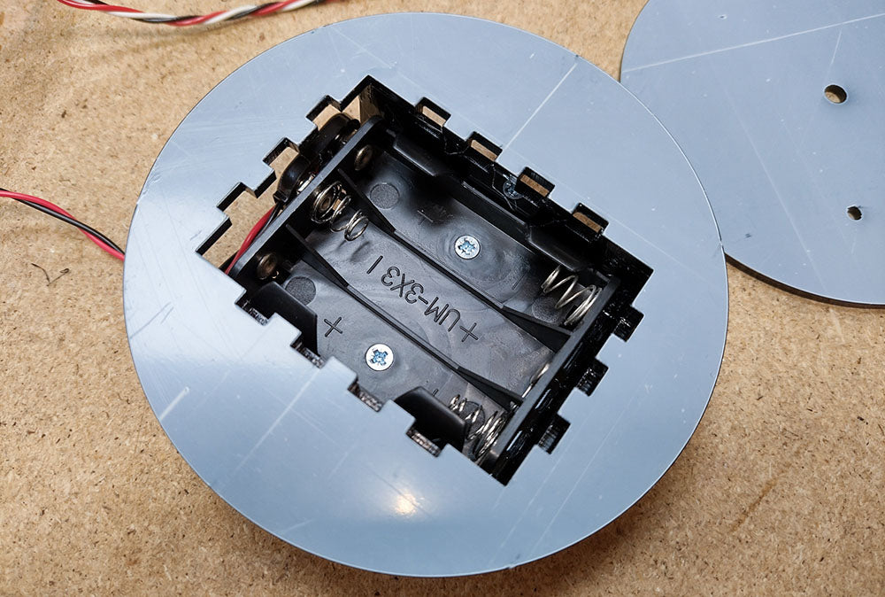 Build the battery pack enclosure on the bottom panel. There will be a gap in the inset box once it’s assembled, and this should be where the connector slots through. Use the two countersunk screws and two hex nuts to fix the battery cage into the enclosure.
