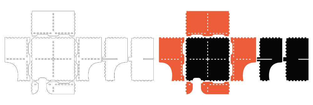 As with the first make, you’ll want to open up the DXF provided at the top of this blog. The image on the left shows how it will look when you open it and the shaded version demonstrates which panels are cut from which materials. Black indicates Frosted Black Value Acrylic, and orange indicates Orange Value Acrylic.