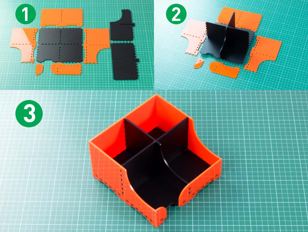 The middle dividers slot together to form an x (shown on the right side of the image labelled 1) and they then slot into the base. Once the middle is in place, attach the side panels one at a time.