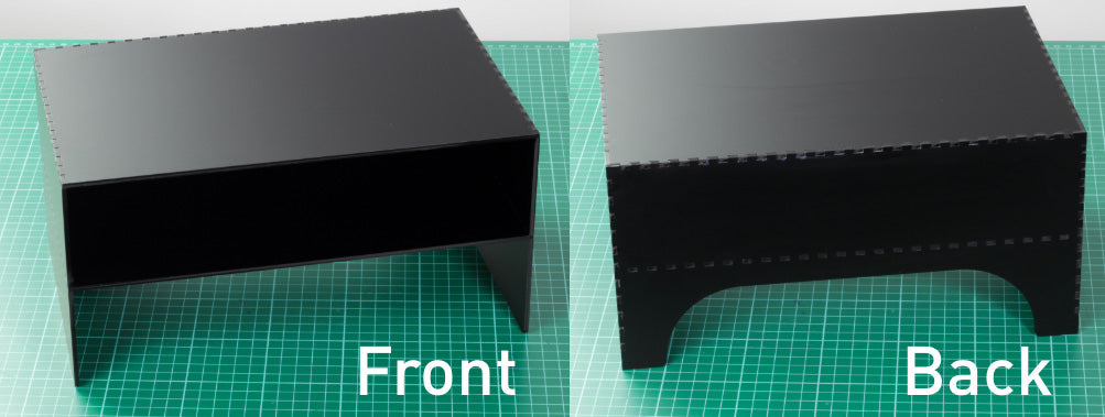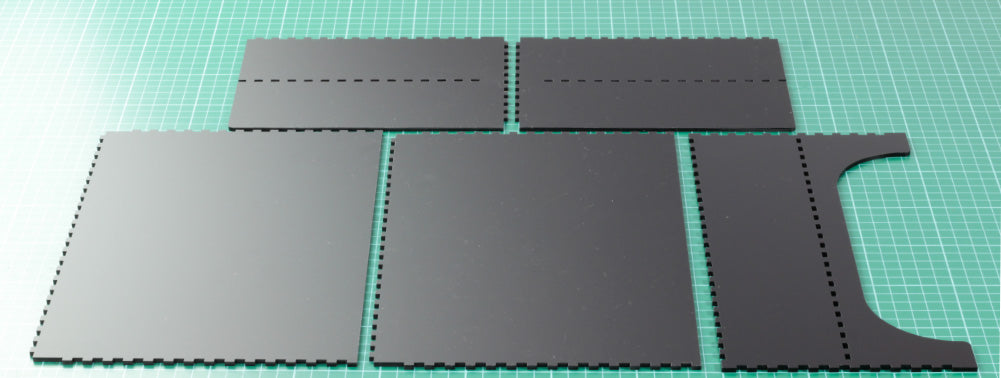 Open up the DXF for the main body of the riser – we will cut the shelf later. This entire section is cut from Value Frosted Black Acrylic.