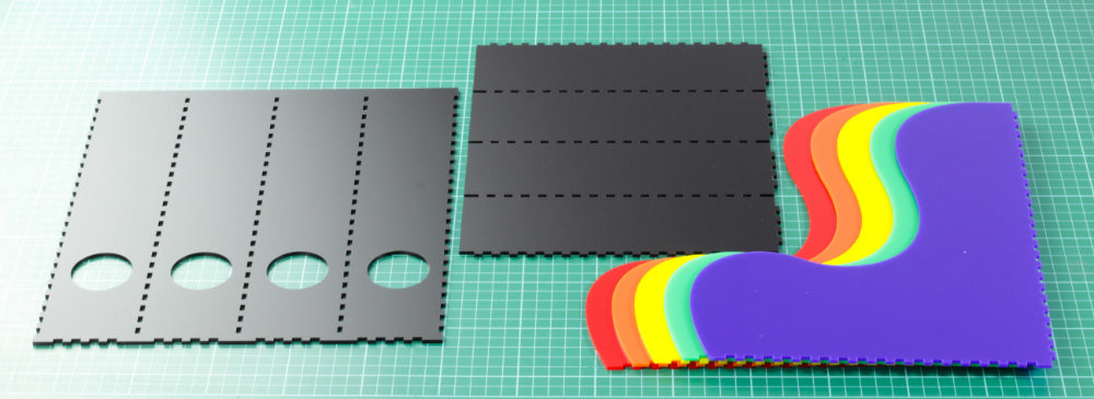 Please Note: These makes can indeed be made individually, however should you choose to make them all at once like we did, it will be a more economic use of acrylic to organise the various pieces of each make onto sheets together by colour.