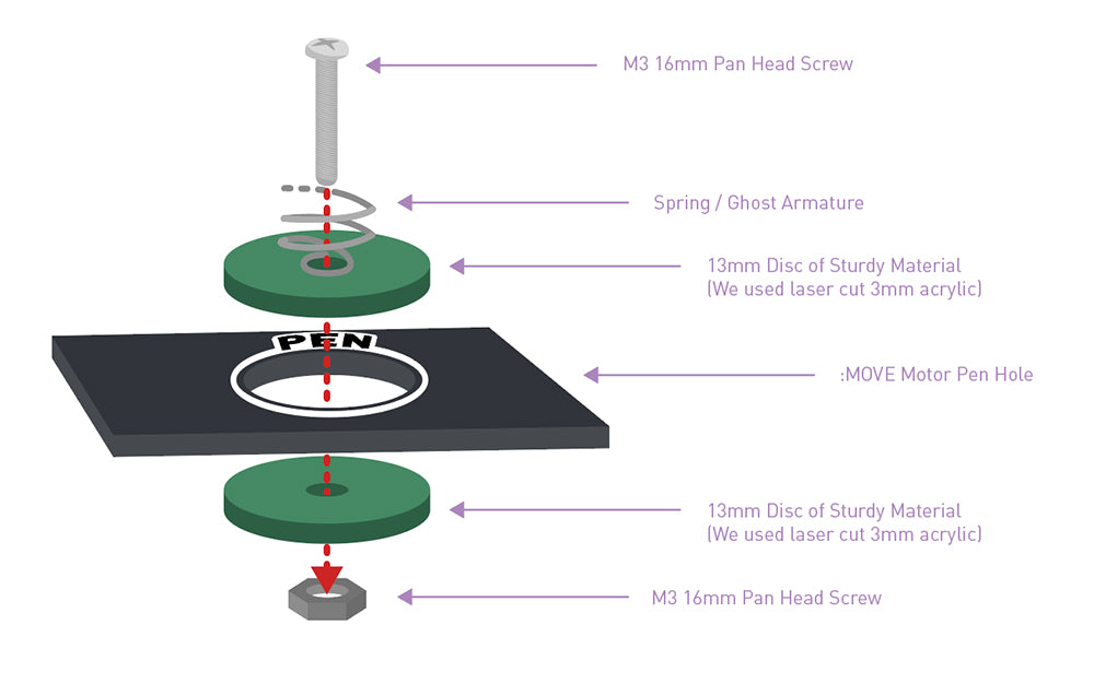 As above, attach the ghost using the Screw and Hex nut, securing the wire armature to the two discs on either side of the pen hole.