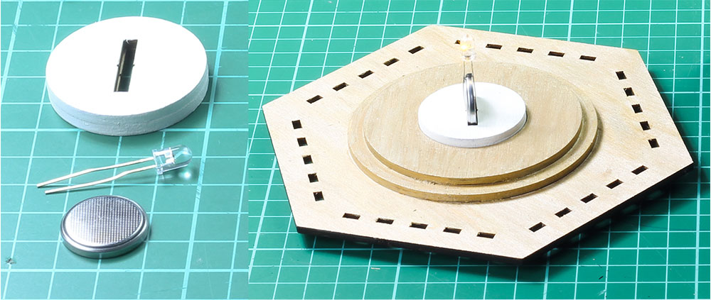 Assemble the LED tealight – there is a more in-depth standalone blog for this make HERE. Stack and glue the wood, then once dry slot the Coin Cell and LED into the slot.