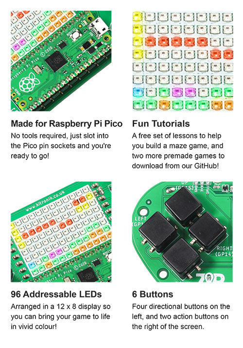 - Kitronik has a Github repo containing MicroPython module and sample code to support using the ZIP96 Gamer with the Raspberry Pi Pico.