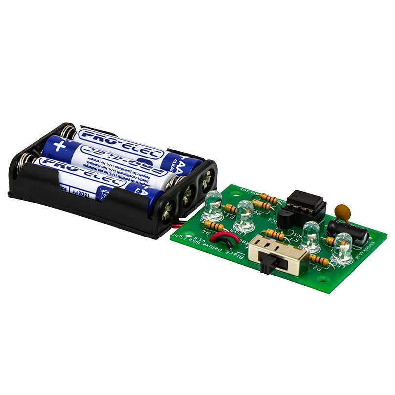 The Kitronik Deluxe Rear Bike Light Kit is easy to build kit and is an excellent way to learn about the very popular 555 timer IC. The kit uses four ultra bright LEDs that can be operated in two modes; constant and flashing.