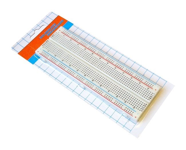 A board for prototyping circuits. Components and wires can be placed into the board and the circuit built and tested without soldering.