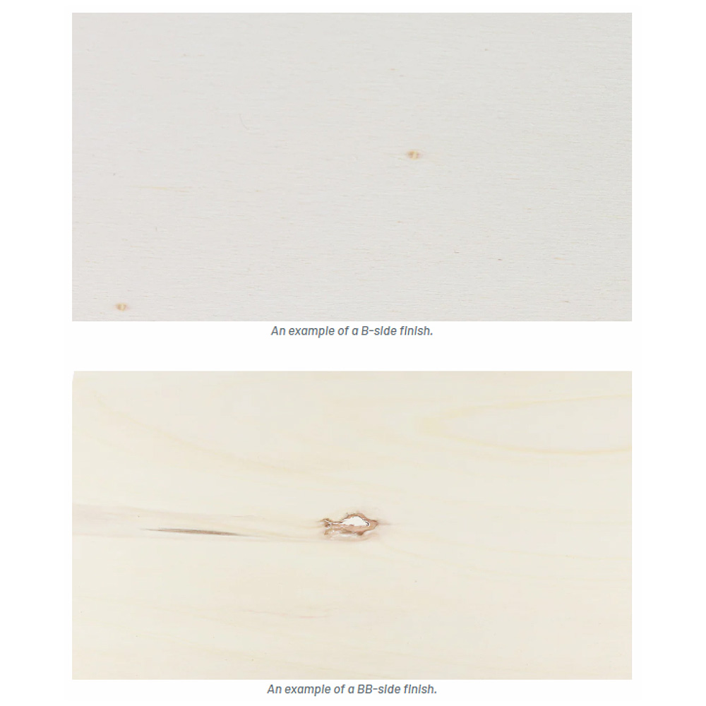 The images below clearly show the B/BB grading. On the Left (top on a small screen) is the B side, and on the right (bottom on a small screen) is the BB side. The B side is high quality but can feature some small knots. The BB side can have both knots and repairs. In the BB side repair shown below, this sheet has been repaired with a white filler. Not all BB sides will feature knots and repairs, this just illustrates that there may be noticeable repairs present.