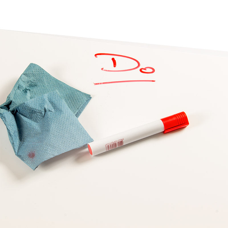 When in use they can be written on with standard whiteboard pens and then wiped clean with a dry eraser. The side of the sheet that has the gloss finish is the side that should be used as the whiteboard surface.
