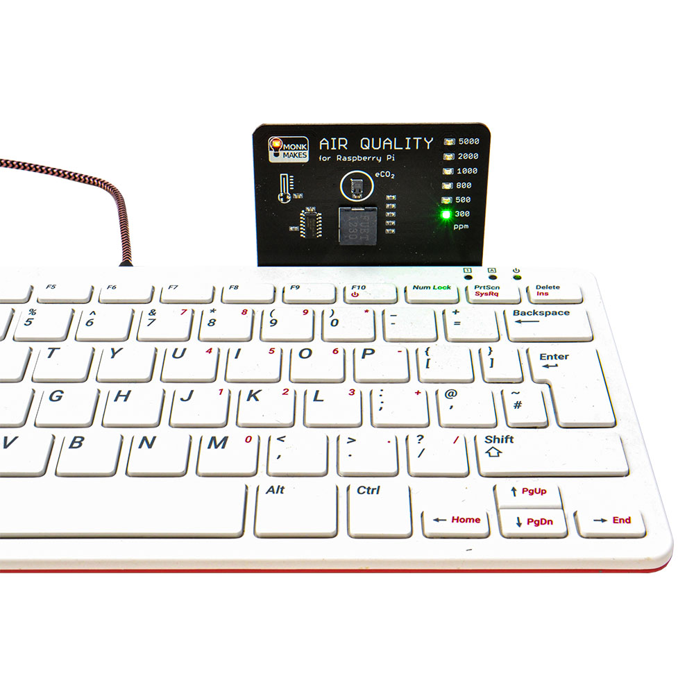 Measure the air quality and temperature in a room and learn about eCO2 with the MonkMakes Air Quality Kit for Raspberry Pi 400 (and Pi 2, 3 and 4).