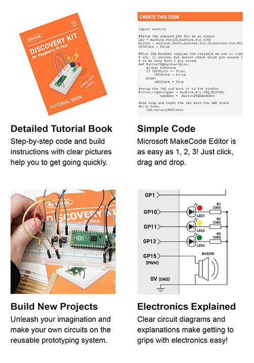 The Kitronik Discovery Kit for Raspberry Pi Pico (Pico not included) is a great way to learn about microcontrollers, Python coding, and physical computing. The kit is supplied with all of the components needed to complete the 7 included experiments, including a large-format breadboard. The kit is packaged in sturdy reusable packaging that can be used to store the kit. This version of the kit is NOT supplied with a Raspberry Pi Pico.