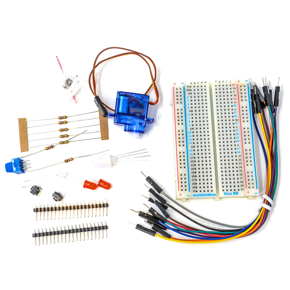 The Monk Makes Electronics Kit 1 for Pico (lite edition) is a low cost, simple to use electronic Kit for the Raspberry Pi Pico. The kit has been designed to teach you basic electronics and coding via the Pico platform.
