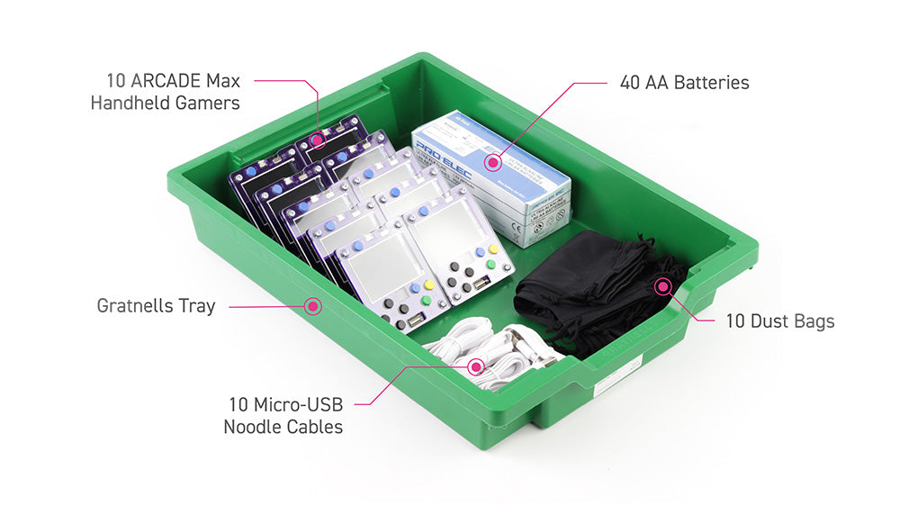 - The classroom pack comes with 10 ARCADE Max gamepads, 10 USB noodle cables, a pack of 40 batteries, and is packaged in a reusable Gratnells tray.
