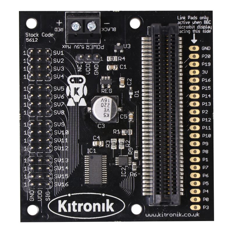 Customer Notice: This board has been redesigned and is available as Kitronik Compact 16 Servo Driver Board for the BBC micro:bit