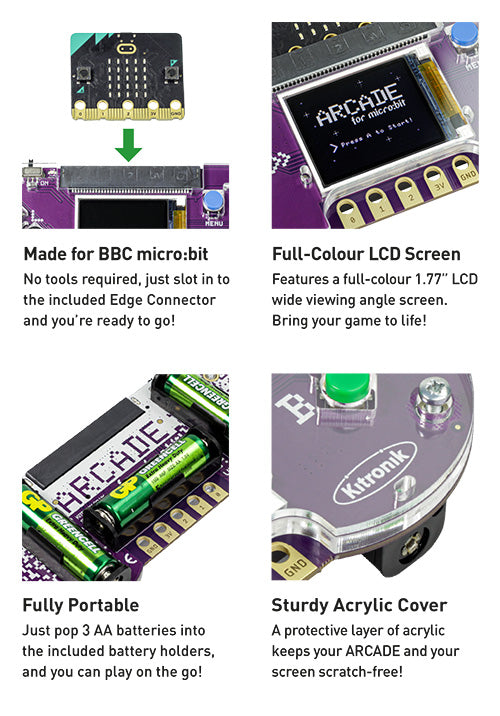 - The Kitronik ARCADE for micro:bit is a feature-packed handheld gamepad for use with BBC micro:bit V2 and the Microsoft Arcade editor.