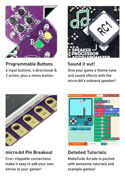 - The ARCADE breaks out the 0, 1, 2, 3V, GND pins from the micro:bit edge connector to croc-clippable pads below the screen.