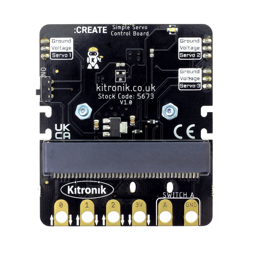 Bring your imagination to life. Simple and uncluttered control of up to 3 servos with the Kitronik :CREATE Simple Servo Control Board for BBC micro:bit.