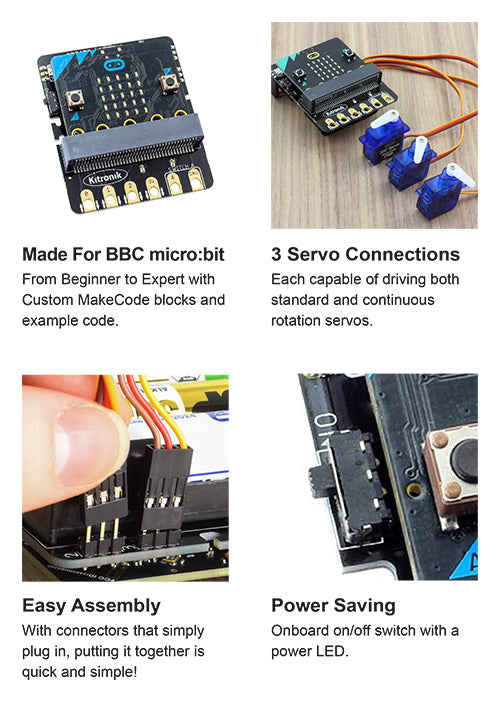 - The board includes a power switch to turn the servo’s and BBC micro:bit on or off.