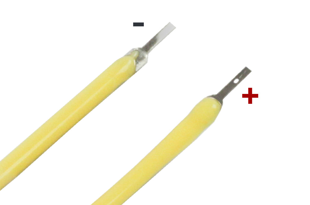 The operating voltage for all of the colour varieties is 3V, on one end of the strip is the + connection (a flat metal tab with a hole in the middle), and on the far end is the – connection (a flat uninterrupted metal tab). Some of the options for powering the filaments are; coincell batteries or AA/AAA battery packs with 2 x 1.5 batteries. If using a power supply that provides more than 3V, a suitable resistor should be used to protect the filament from damage. For more detailed technical information, please refer to the Datasheet.